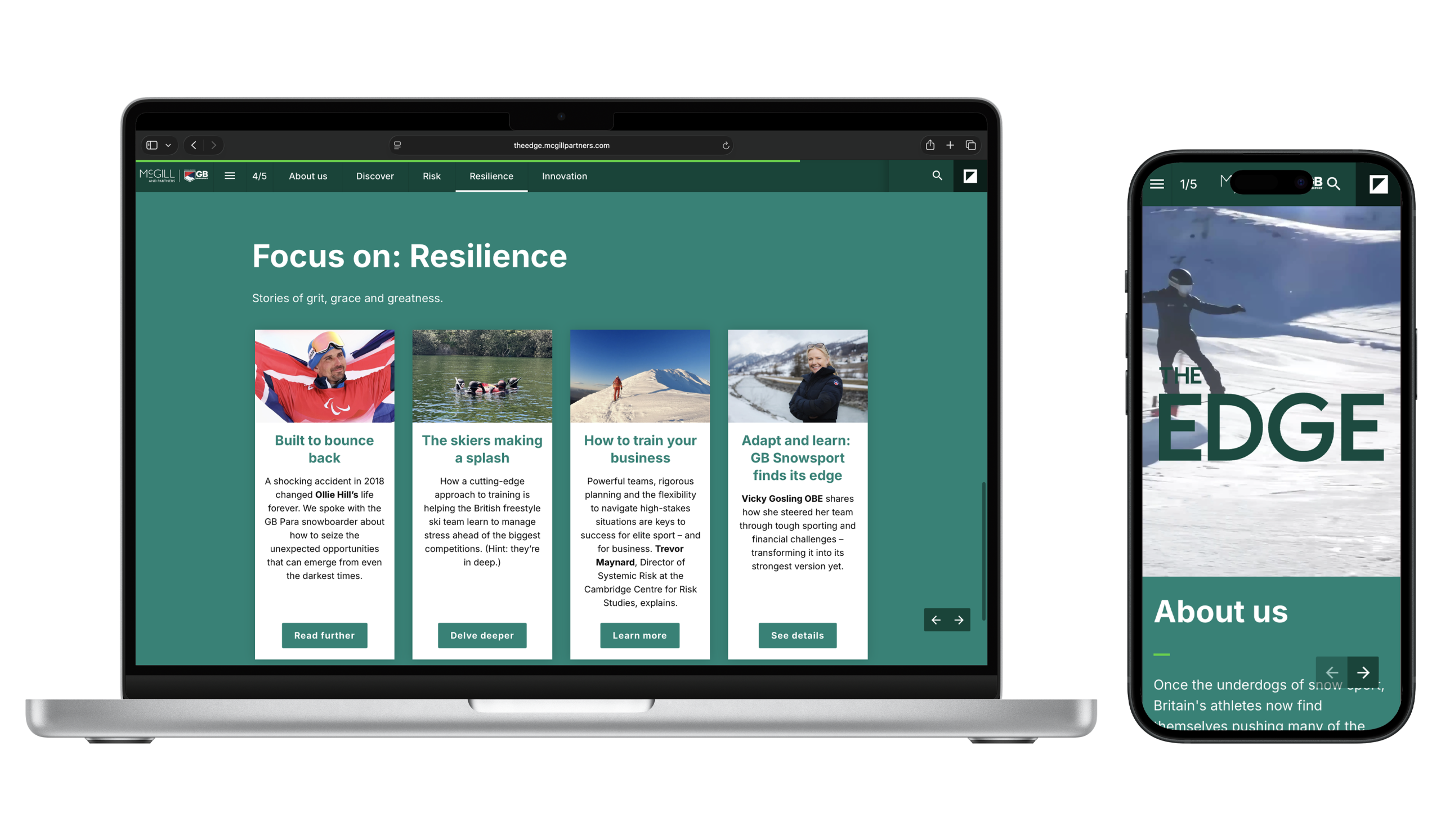 We developed The Edge, a content series built on core themes (risk, resilience, leadership and innovation) that would demonstrate the partnership and exchange between the two brands. With deep collaboration between all the relevant teams, we have delivered a multimedia strategy, produced work across platforms, and brought to life the achievements of McGill and Partners and GB Snowsport, two challenger brands that have each overcome formidable challenges to achieve staggering success over the past few years.